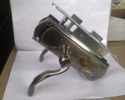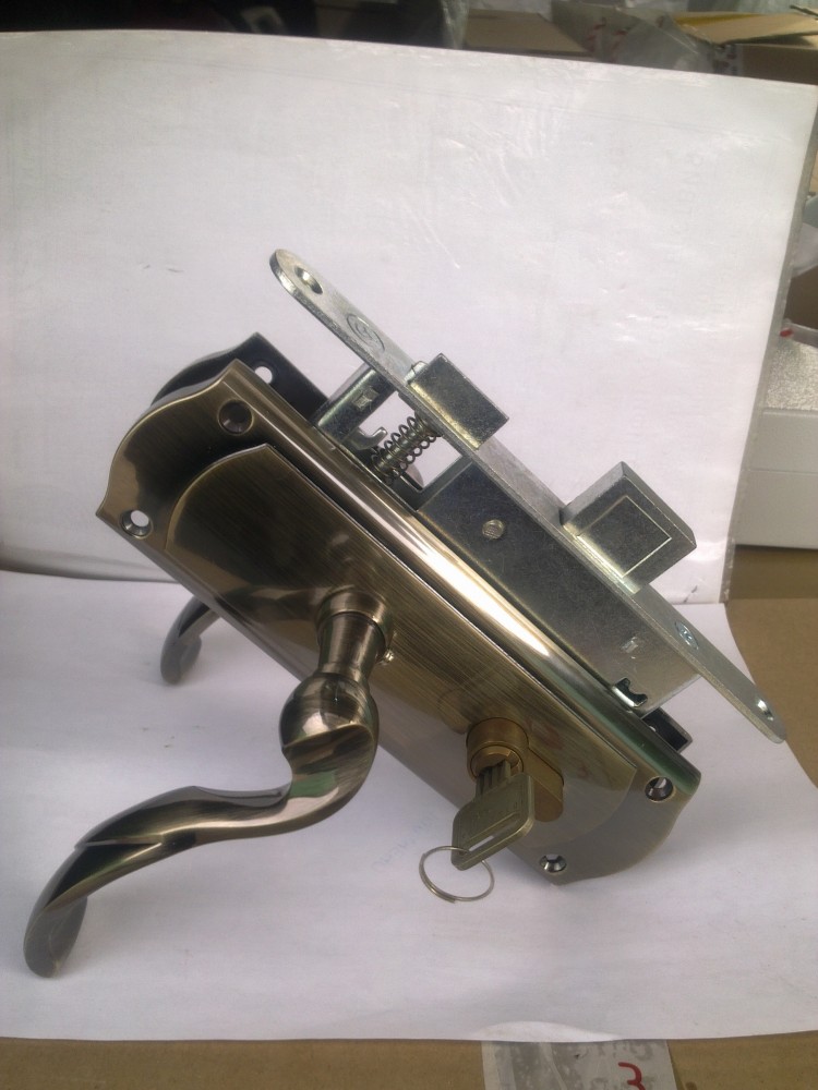 Замок для межклмнатных дверей с отдельной защелкой и ригалем. Межосевое расстояние-85 мм, удаление ключевого отверстия-50 мм. Цвет-золото
