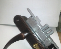 Замок для межклмнатных дверей с отдельной защелкой и ригалем. Межосевое расстояние-85 мм, удаление ключевого отверстия-50 мм. Цвет-бронза