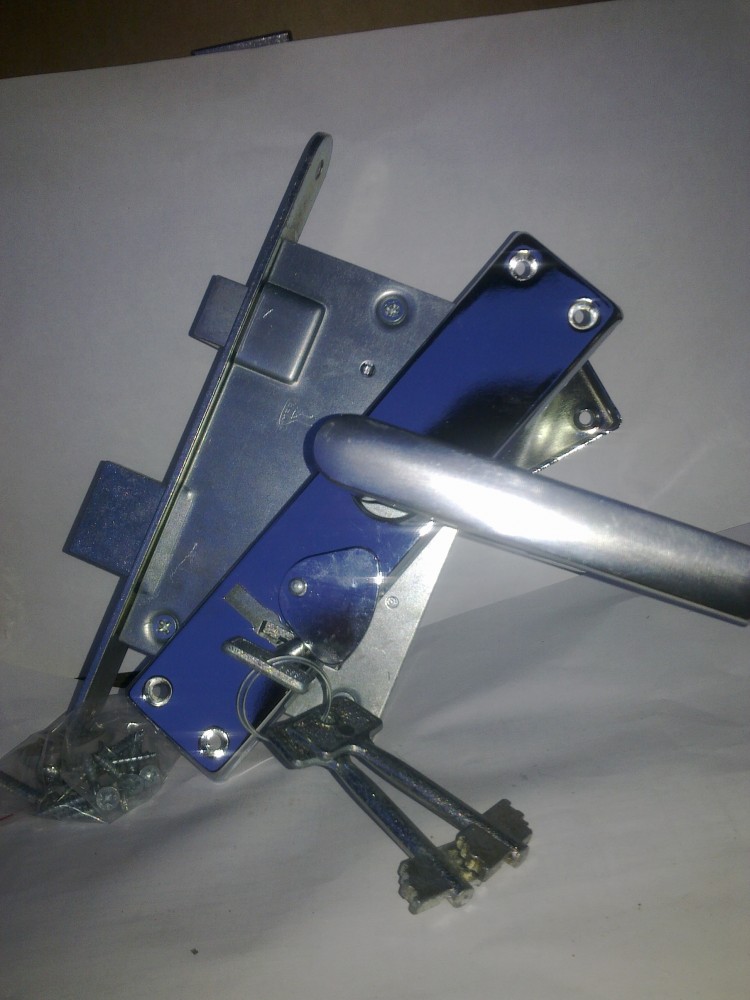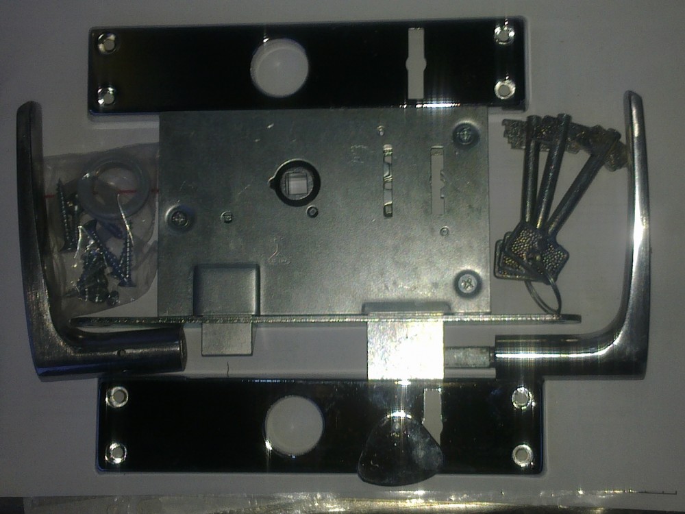 Замок для межклмнатных дверей с отдельной защелкой и ригалем. Межосевое расстояние-85 мм, удаление ключевого отверстия-50 мм. Цвет-золото