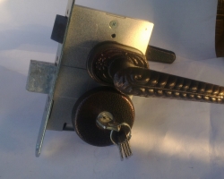 Замок для межклмнатных дверей с отдельной защелкой и ригалем. Межосевое расстояние-85 мм, удаление ключевого отверстия-50 мм. Цвет-бронза