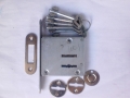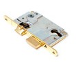 Замок для межклмнатных дверей с отдельной защелкой и ригалем. Межосевое расстояние-85 мм, удаление ключевого отверстия-50 мм. Цвет-золото