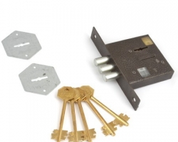 Замок для межклмнатных дверей с отдельной защелкой и ригалем. Межосевое расстояние-85 мм, удаление ключевого отверстия-50 мм. Цвет-хром