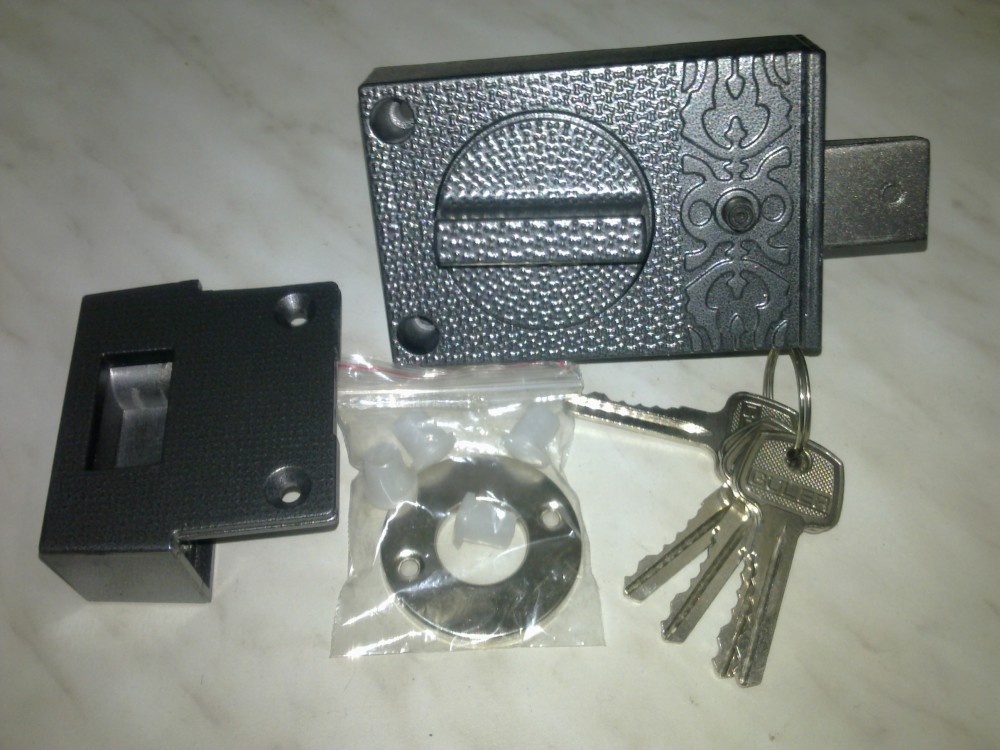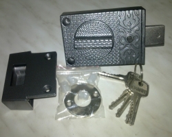 Замок для межклмнатных дверей с отдельной защелкой и ригалем. Межосевое расстояние-85 мм, удаление ключевого отверстия-50 мм. Цвет-хром